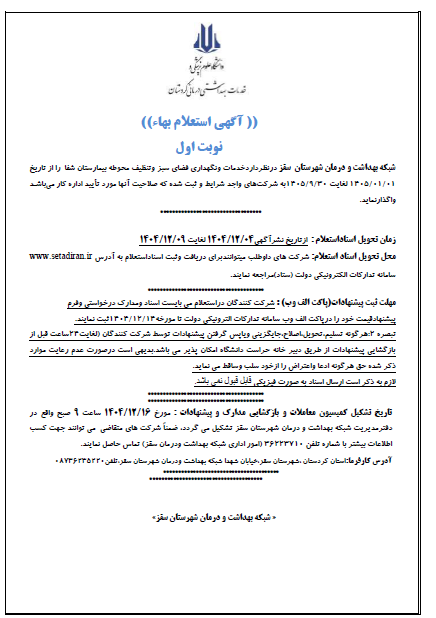 شبکه بهداشت ودرمان شهرستان سقزدر نظرداردانجام امورات فضای سبزوتنظیف محوطه بیمارستان شفا شهرستان سقزرا درسال 1405به مدت 9 ماه از تاریخ 1/01/1405 لغایت30/09/1405 (نوبت اول) از طریق استعلام بهاء به شرکتهای واجد شرا یط وا گذارنماید